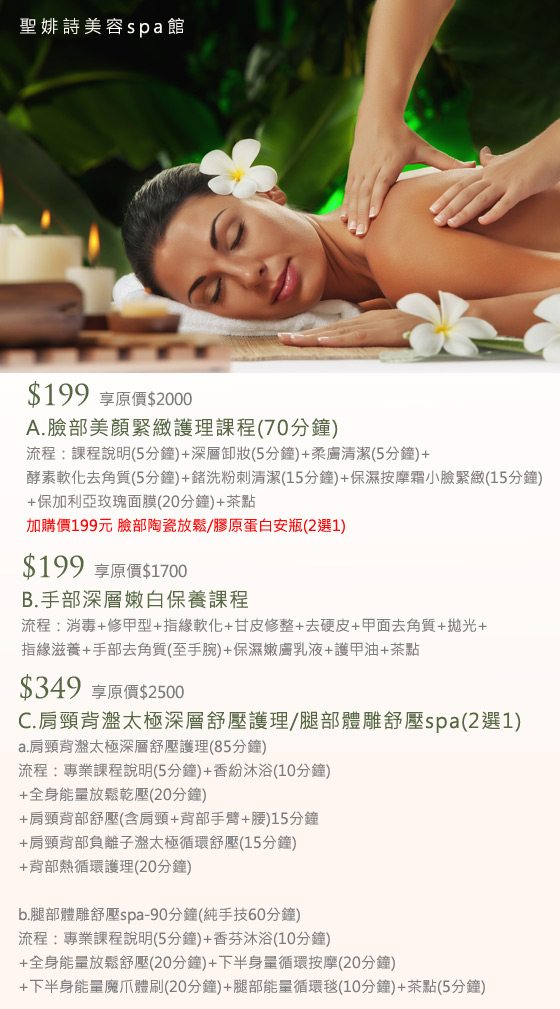 | 聖婔詩美容spa館-美容美體方案-讓自己擁有全方案的寵愛!臉部美顏、手部嫩白、肩頸與背部舒壓,還有最重要的雙腿呵護,成為最棒的女人吧!只要199元起即可享受【聖婔詩美容spa館】原價最高2500元美容 售價:199 我要購買 |