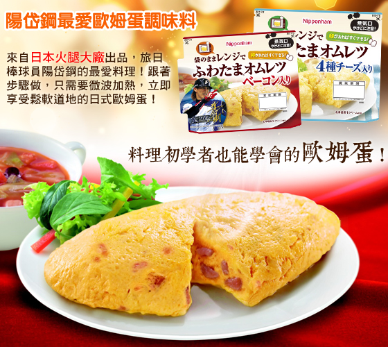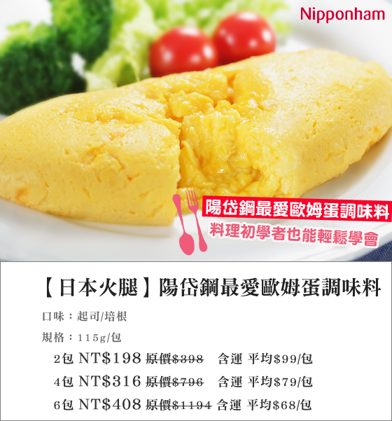| 日本火腿-陽岱鋼最愛歐姆蛋調味料-陽岱鋼最愛歐姆蛋調味料,最低一包只要68元!料理白癡也能頭好壯壯,享受最極致的道地歐姆蛋平均每包最低只要68元起(含運)即可享有【日本火腿】陽岱鋼最愛歐姆蛋調味料2包 售價:68 我要購買 |