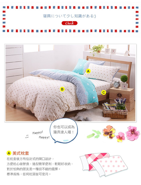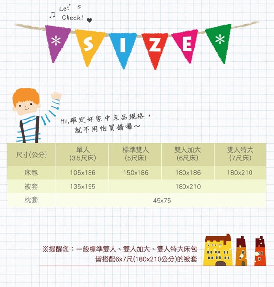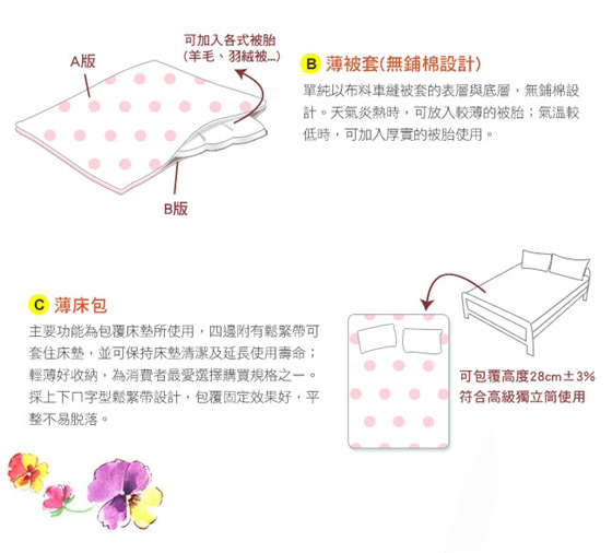寵愛自己的第一步,給自己絕佳的睡眠品質 ![]() ![]() ![]() ![]() ![]() ![]() ![]() ![]() ![]() ![]() ![]() ![]() ![]() ![]() ![]() ![]() ![]() ![]() ![]() ![]() ![]() 商品說明 單人三件組: .商品內容/保養方式 .內容件數:薄床包x1+薄被套x1+薄枕套x1,三件/組 .材質:超柔斜紋布(100%聚酯纖維) .產地:中國(台灣設計,台商監製) .尺寸: 被套-4.5x6.5尺(135x195cm)±3% 床包-3.5x6.2尺(105x186cm)±3%,可包覆床墊高度28cm±3% 薄枕套-1.5x2.5尺(45x75cm)±3% .隱密式ㄇ字型床包收縮帶:有 .被套內四角綁繩:有 雙人四件組: .商品內容/保養方式 .內容件數:薄床包x1+薄被套x1+薄枕套x2,四件/組 .材質:超柔斜紋布(100%聚酯纖維) .產地:中國(台灣設計,台商監製) .尺寸: 被套-6x7尺(180x210cm)±3% 床包-5x6.2尺(150x186cm)±3%,可包覆床墊高度28cm±3% 薄枕套/1.5x2.5尺(45x75cm)±3% .隱密式ㄇ字型床包收縮帶:有 .被套內四角綁繩:有 雙人加大四件組: .商品內容/保養方式 .內容件數:薄床包x1+薄被套x1+薄枕套x2,四件/組 .材質:超柔斜紋布(100%聚酯纖維) .產地:中國(台灣設計,台商監製) .尺寸: 被套-6x7尺(180x210cm)±3% 床包-6x6.2尺(180x186cm)±3%,可包覆床墊高度28cm±3% 薄枕套-1.5x2.5尺(45x75cm)±3% .隱密式ㄇ字型床包收縮帶:有 .被套內四角綁繩:有 顏色:如圖,網頁產品因拍攝關係,與實品略有差異,實品顏色更佳 。產品圖僅供參考,實際內容以上述為主。 清潔保養方式:可水洗(水溫不可超過攝氏40度)/可乾洗/不可烘乾/不可漂白 ※商品圖檔顏色因電腦螢幕設定差異會略有不同,以實際商品顏色為準。 ※商品為平放測量,可能會因某些因素產生些許誤差,誤差值在1~3公分上下為合理範圍。 |
