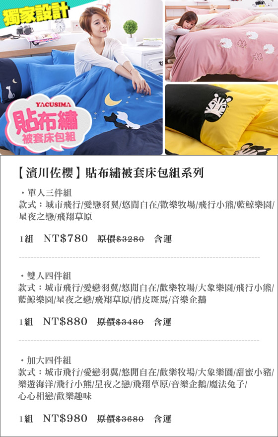 | 濱川佐櫻-貼布繡被套床包組系列-用對好品質的床包就像換了一張新床!讓睡眠變得更舒適,觸感柔軟呵護您的肌膚,透氣舒適、手感親柔!只要780元起(含運)即可購得【濱川佐櫻】原價最高3680元貼布繡被套床包 售價:780 我要購買 |