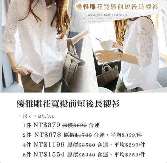 | 優雅雕花寬鬆前短後長襯衫-個性女人穿搭!舒適白色系襯衫搭配簡約雕花設計,前短後長設計率性又俏皮,短褲、長裙與長褲都適合穿搭!平均每件最低只要259元起(含運)即可購得優雅雕花寬鬆前短後長襯衫1件/2件 售價:259 我要購買 |